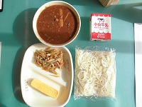 ソフト麺 牛乳 肉味噌かけ 厚焼き卵 きんぴらゴボウでした。